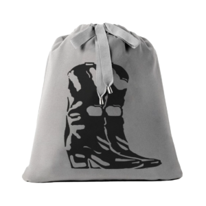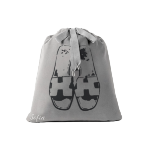 Fabricada con tela 100% tergal en un elegante color gris y con un estampado en serigrafía color negro, nuestra bolsa no solo protege tus tenis, sino que también añade un toque de estilo a tu almacenamiento. Sus dos listones de popotillo permiten ajustarla fácilmente para adaptarse al tamaño de tus tenis, mientras que las bellotas plateadas de metal le dan un acabado sofisticado.
